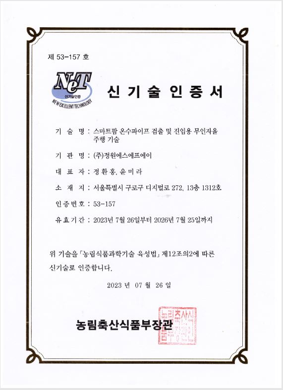 CERTIFICATION 축적된 기술과 인증현황 인증서 신기술 인증서 페이지 정보 작성자 ㈜정원SFA 댓글 0건 조회 18회 작성일 26-04-03 09:36 목록 본문 신기술 인증서 이전글전자적합성 인증서 26.04.03 다음글ISO9001 24.06.18 댓글 0 댓글목록 등록된 댓글이 없습니다.