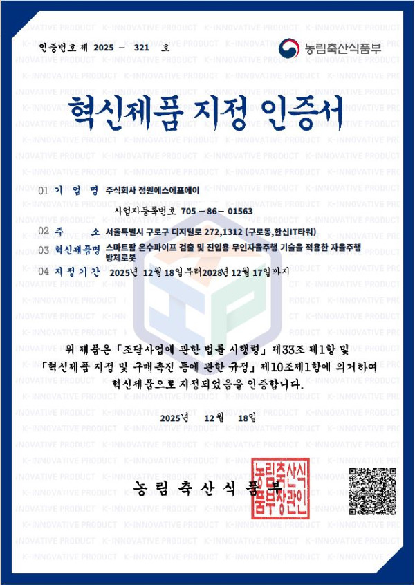 CERTIFICATION 축적된 기술과 인증현황 인증서 혁신제품인증서 페이지 정보 작성자 ㈜정원SFA 댓글 0건 조회 24회 작성일 26-04-03 09:50 목록 본문 혁신제품인증서 다음글전자적합성 인증서 26.04.03 댓글 0 댓글목록 등록된 댓글이 없습니다.